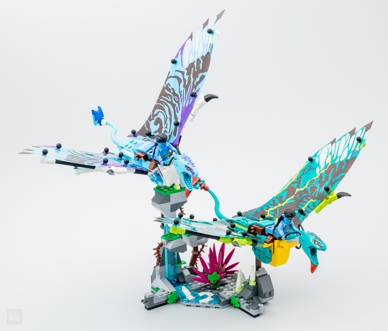 - Les Banshees sont articulés et ont des ailes en plastique flexible avec des motifs colorés sur celles-ci, donc les enfants peuvent attraper les minifigurines LEGO de Jake et Neytiri et les mettre sur leur dos pour voler autour des montagnes !
