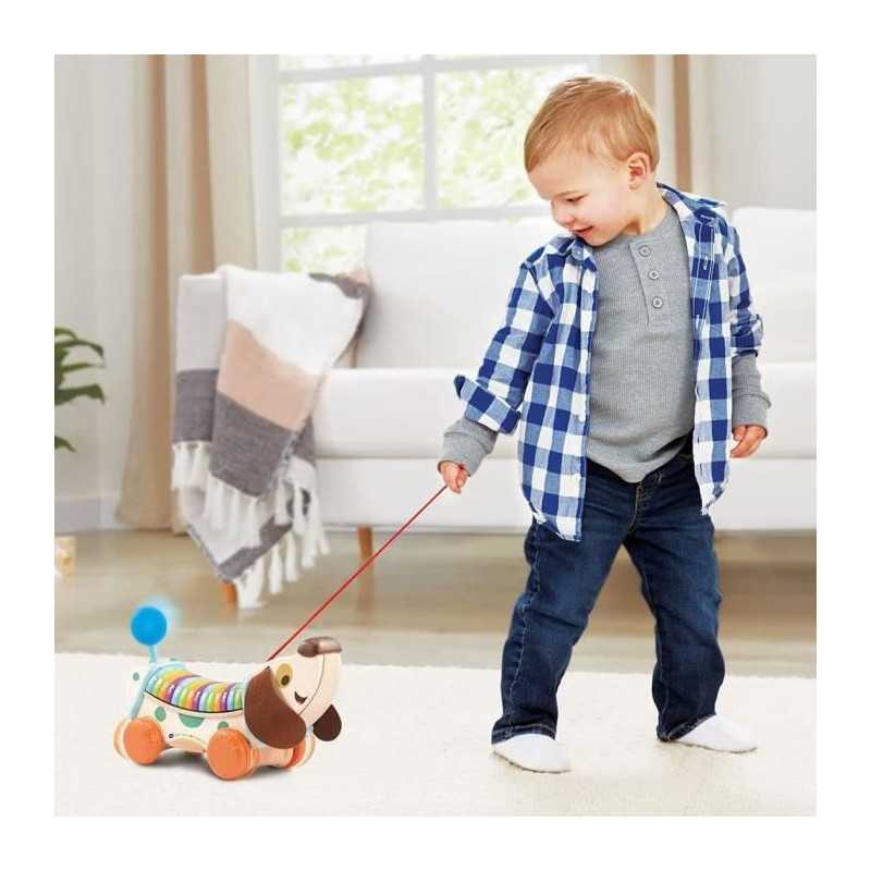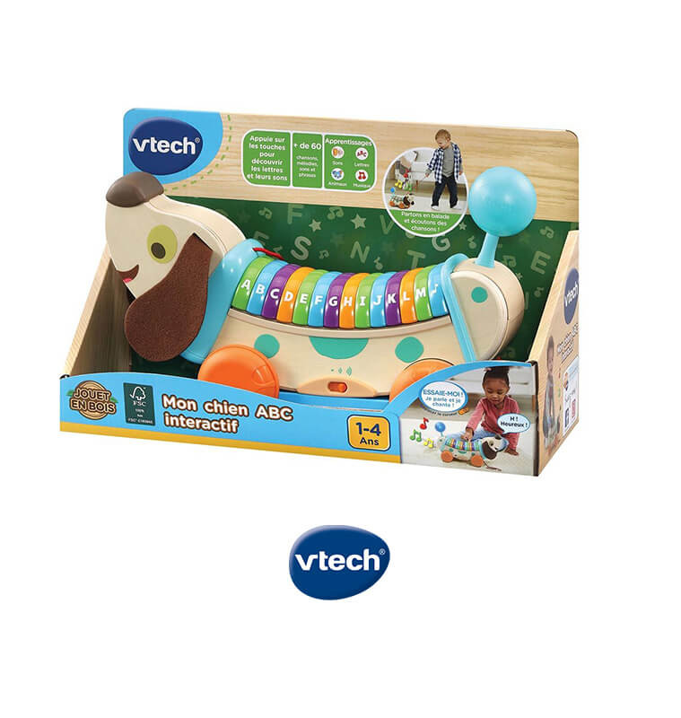 Mon chien ABC interactif partiellement en bois certifié FSC® est un super compagnon de jeu pour apprendre l’alphabet. Votre tout-petit se promène en chansons tout en exerçant sa motricité. En appuyant sur les touches colorées, il découvre les lettres et leurs sons ainsi que de nouveaux mots de vocabulaire tout en s’amusant.