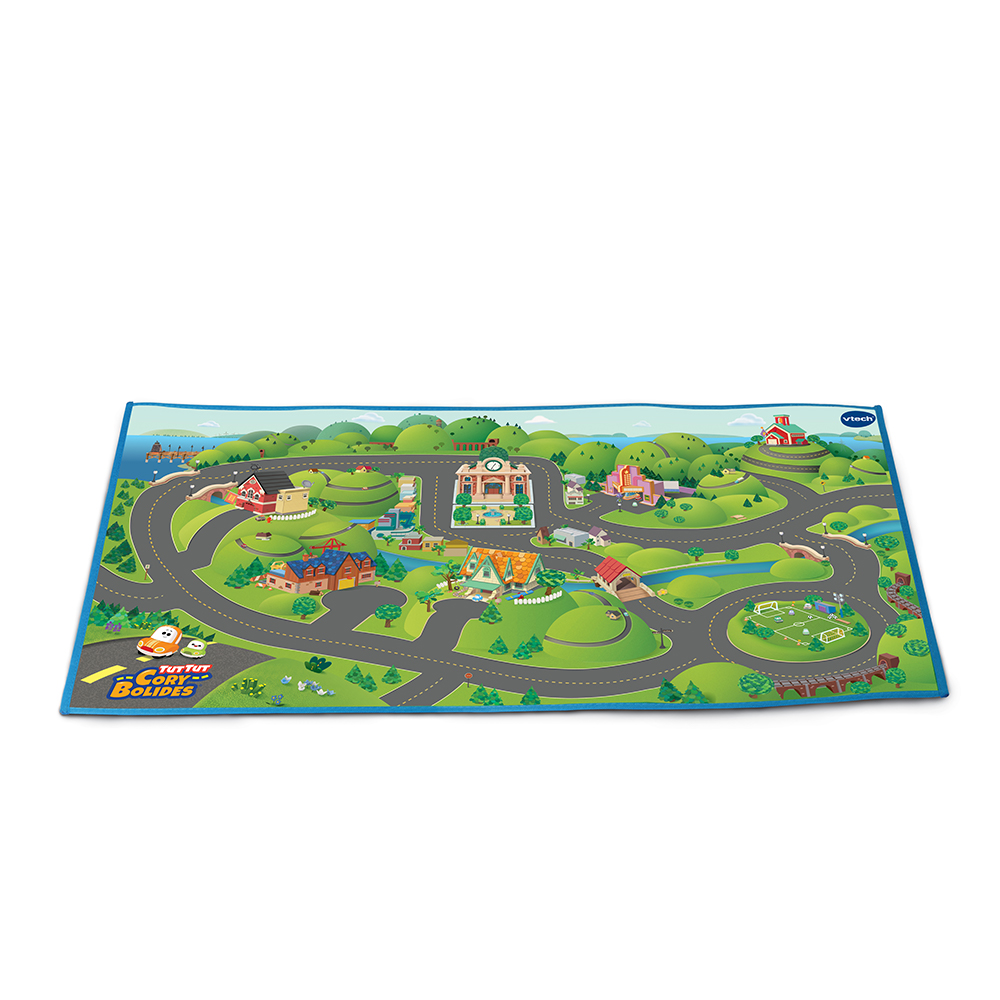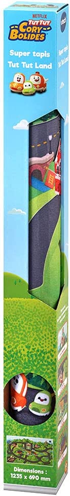 Tut Tut Cory Bolides. Super tapis Tut Tut Land. De 1 à 5 ans. Un tapis de route géant pour faire circuler tous les bolides ! L’enfant découvre les lieux emblématiques de la série Tut Tut Cory Bolides : l’école, la mairie, la caserne de pompiers, la maison des Buldo, le terrain de foot et la maison de Cory ! Dimensions : 123,5 cm x 69 cm.